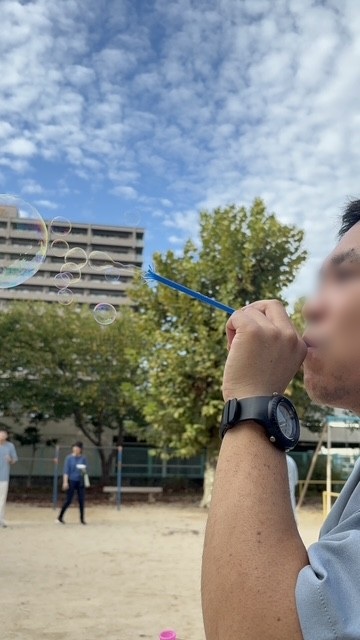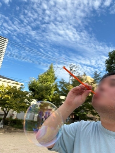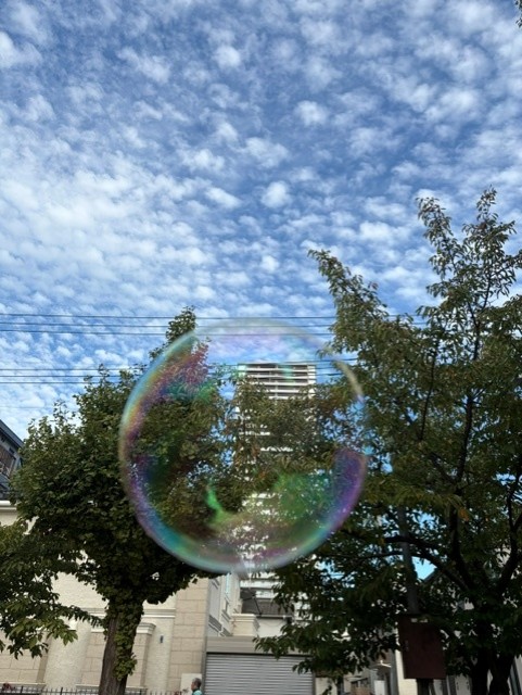 秋晴れに浮かぶシャボン玉。不安を抱えるご利用者様を癒してくれますね!